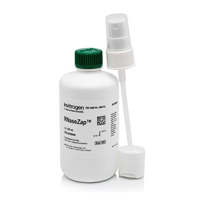 RNaseZap™ RNase 去污液是一种经接触破坏 RNase 的表面去污溶液。您只需将 RNaseZap™ 溶液喷洒在要去除污染的表面上,然后用无 RNase 水将其冲洗掉,即可高效清除 RNase 污染。