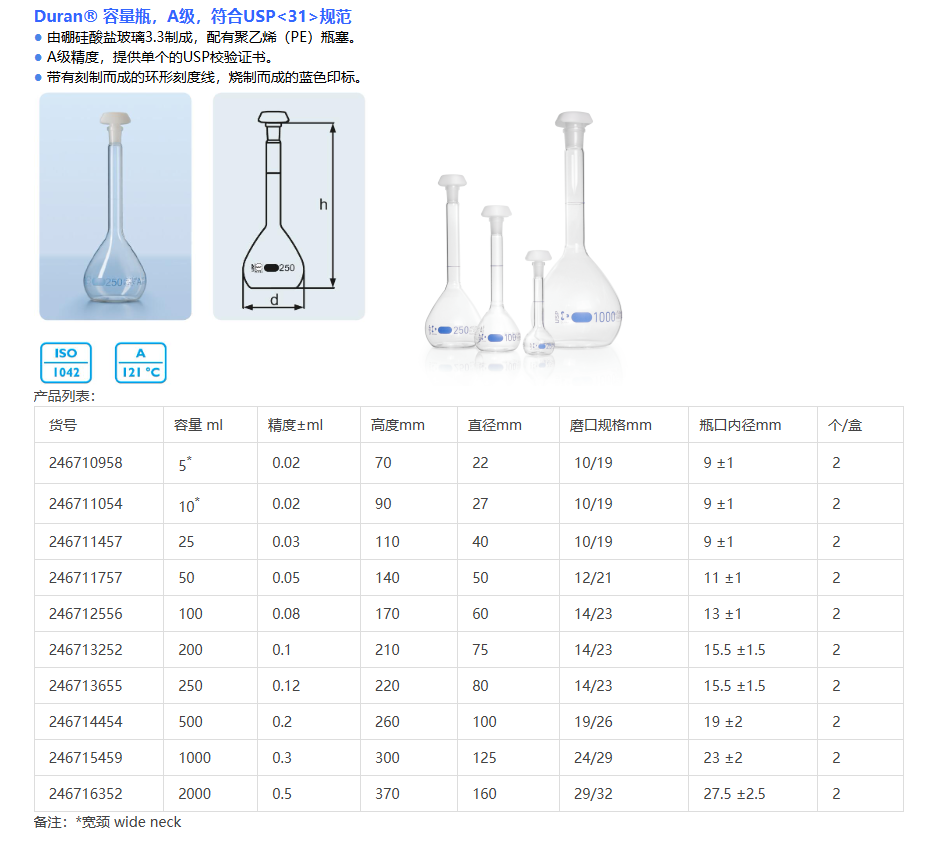 产品品牌:Duran® 肖特玻璃容量瓶,A级,PE塞 USP级